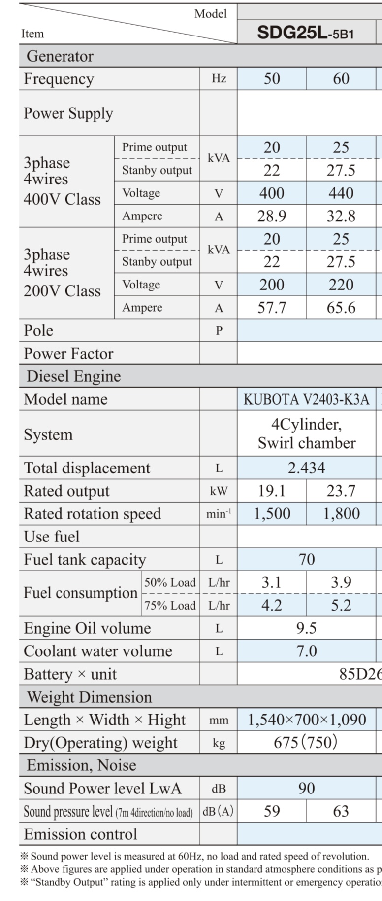 • Khối lượng chứa nhiên liệu : 750 kg – Công suất đầu ra 20/25KVA
